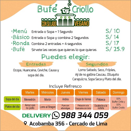 20.06.25--Chupe --Jalea --Crema de Rocoto --Escabeche --Arroz c/Mariscos --Lomo Saltado ---- (S/.12.00)19.06.25--Crema de Zapallo --Torrejitas de Maiz --Ocopa --Bistec Montado --Saltado de Vainita --Lomo Saltado ---- (S/.12.00)